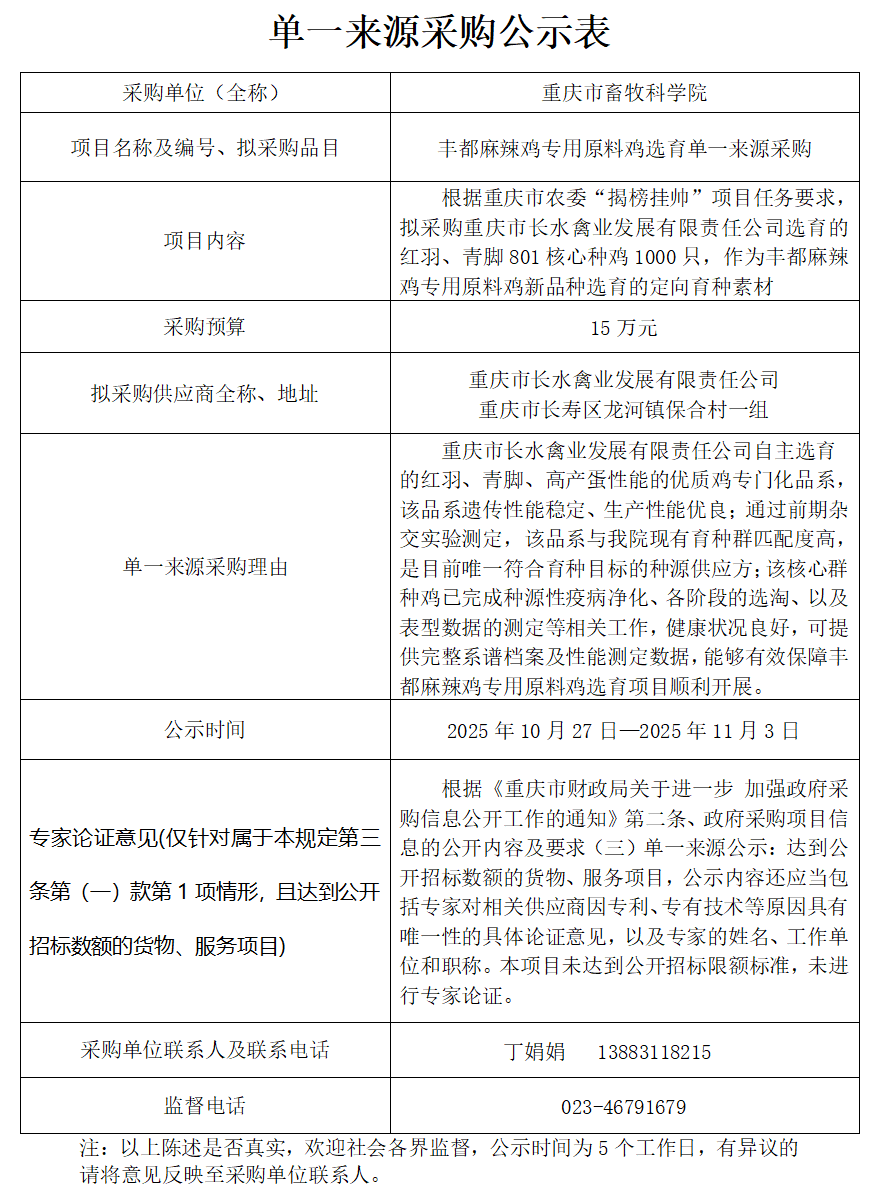 丰都麻辣鸡专用原料鸡选育单一来源采购公示表